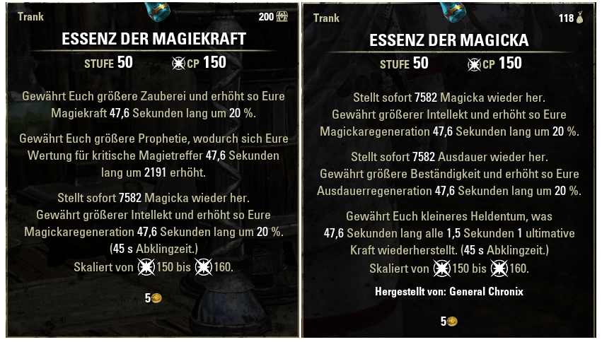 Ich nutze meistens zwei verschiedene Tränke, die je nach Situation sehr nützlich sind. Zum einen die Magiekrafttränke, welche ggf. auch von Magicka DDs genutzt werden und zum anderen die Heldentumtränke (Ulti-Pots). Letztere Empfehle ich aber wegen der hohen Kosten nur in optimierten Gruppen, wo es sich lohnt diese Tränke zu spielen. Vorsicht, die Ulti-Pots heißen auch nur "Essenz der Magicka", sind aber völlig andere als die, die ihr hinterhergeworfen bekommt.