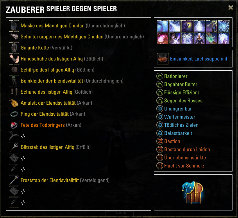 Als 1. 5er Set, welches über den Frontbarstab vervollständigt wird trage ich listiger Alfiq, dadurch wird die Magicka gesteigert und ihr erhaltet weitere Defensive. Es ist wichtig, dass ihr bei diesem Setup dann das Schild als Fertigkeit auch auf dieser Skillleiste verwendet.